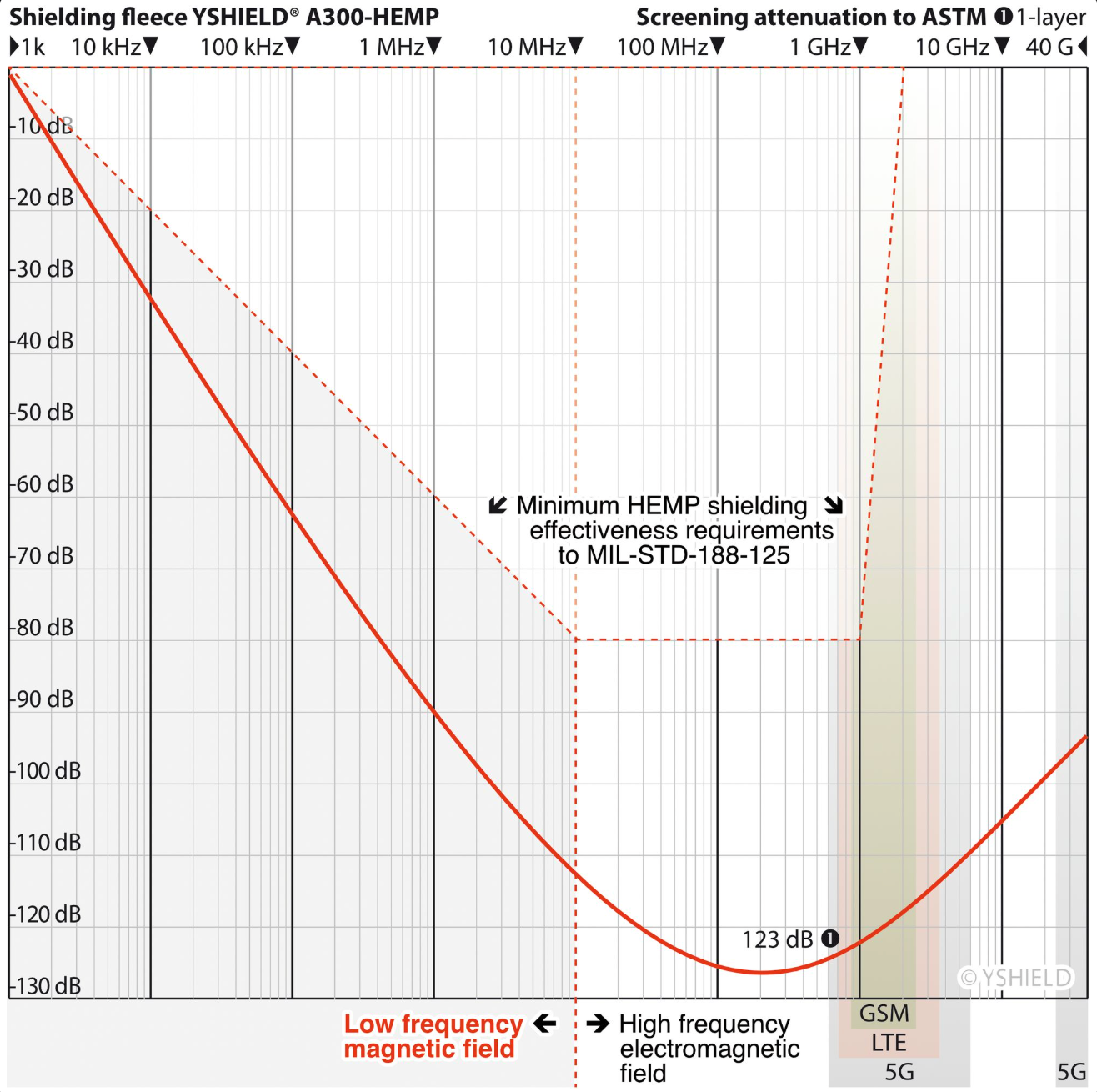YSHIELD A300-HEMP is een hoogwaardig, professioneel afschermmateriaal dat voldoet aan de strenge militaire norm MIL-STD-188-125. Deze norm wordt wereldwijd gebruikt voor de beveiliging van kritieke infrastructuur tegen elektromagnetische invloeden. A300-HEMP is specifiek ontwikkeld om uitzonderlijk hoge bescherming te bieden tegen zowel elektromagnetische straling (zoals wifi, 4G/5G en andere HF-bronnen) als tegen HEMP-pulsen (High-Altitude Electromagnetic Pulse), die bekend staan om hun extreme kracht en snelle impact. Dankzij de combinatie van geavanceerde laminaattechnologie en een zeer hoge afschermingsprestatie biedt dit materiaal een bijzonder betrouwbare en professionele EMF-bescherming voor zowel woon- als werkomgevingen.