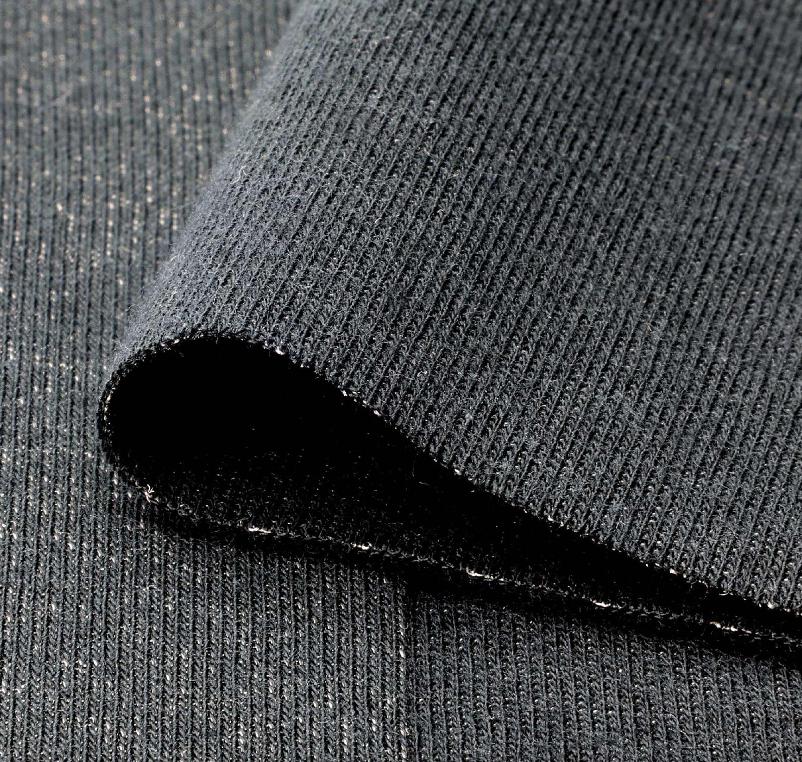 De jerseyconstructie geeft precies de stretch die je zoekt: ca. 40% in de breedte en 15% in de lengte. Met een gewicht van ± 165 g/m² en een oppervlakteweerstand van ca. 3 Ω per inch, blijft de stof vormvast genoeg voor dagelijkse confectie en wasbeurten. De kleur is diep zwart met aan één zijde een subtiele metallische glans – discreet van buiten, high-tech van binnen.